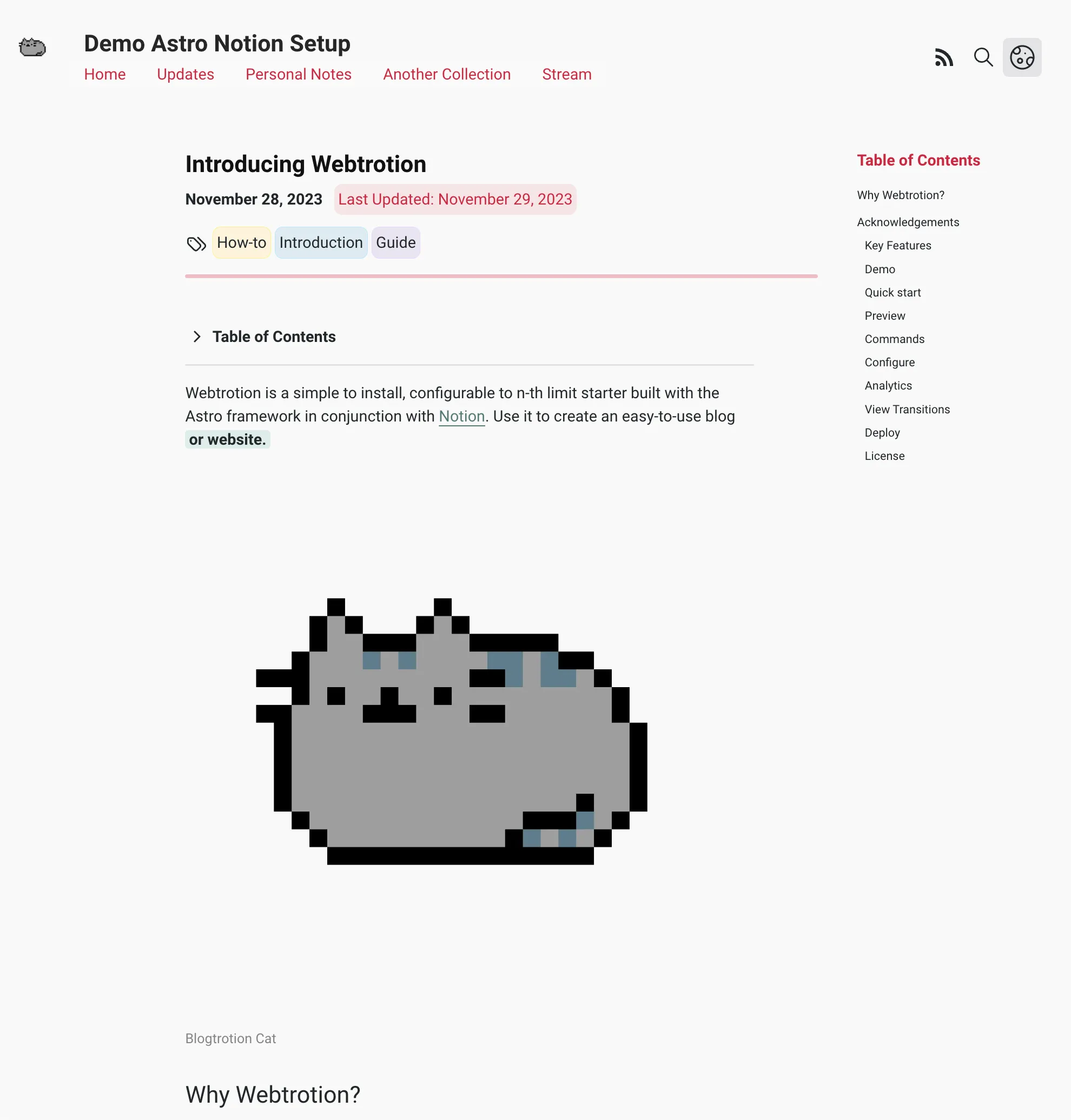 Webtrotion is a simple to install, configurable to limit starter built with the Astro framework in conjunction with Notion. Use it to create an easy-to-use blog or website.